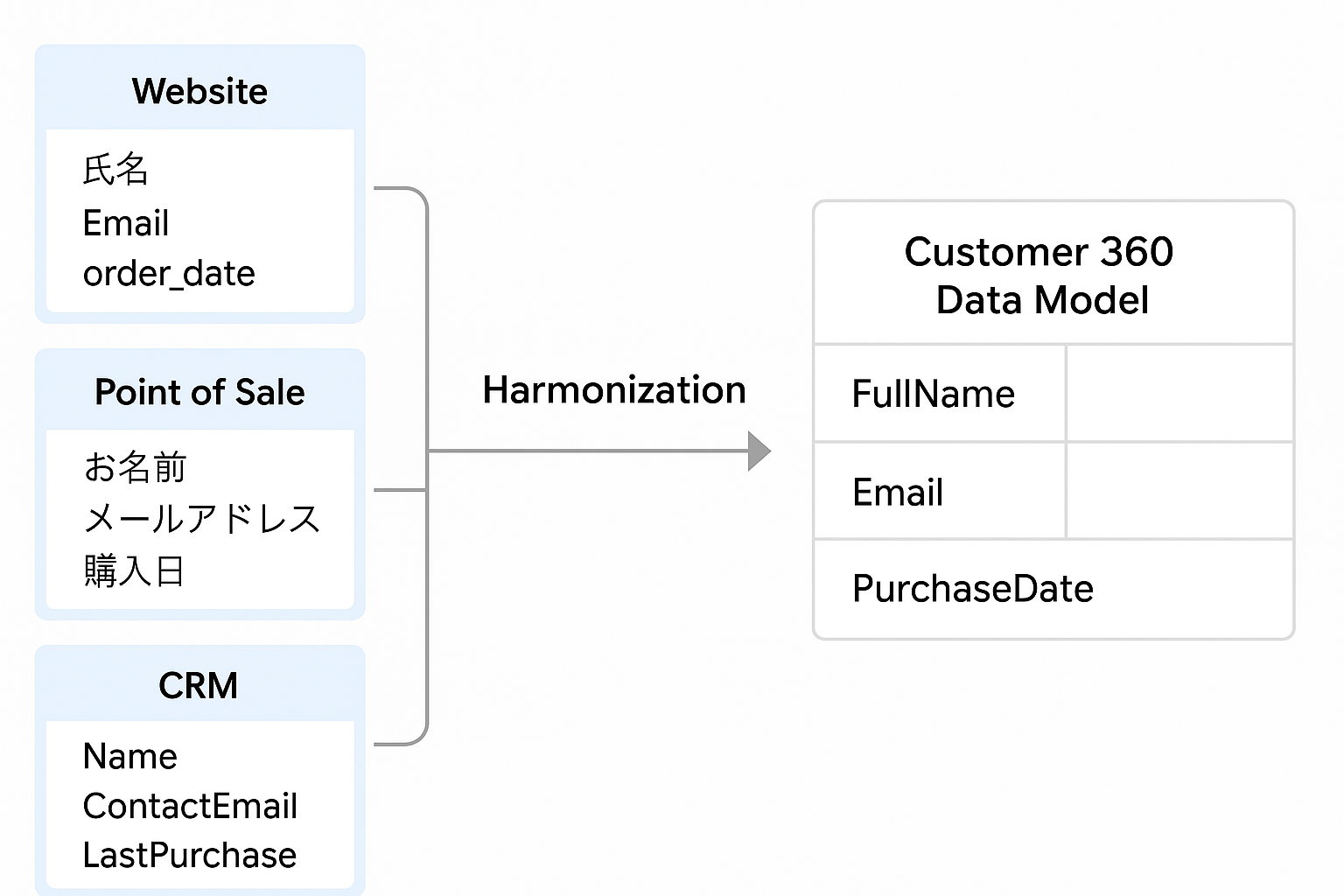 ハーモナイゼーション:取り込んだデータをCustomer360データモデルにマッピングするプロセス=色々なデータを共通のモデルに揃えること