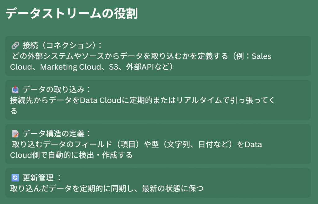 データストリーム:Data Cloud にデータを取り込むための接続と関連データのこと