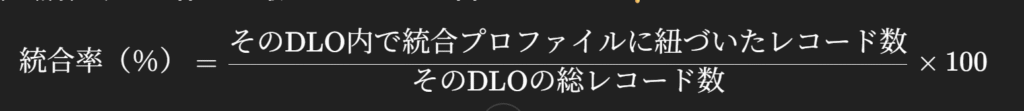 統合率:データソースに含まれるレコードのうち、どれくらいが ID 解決によって「統合プロファイル」に紐づいた割合=このデータソースがきちんと他データと繋がっているかを示す数値